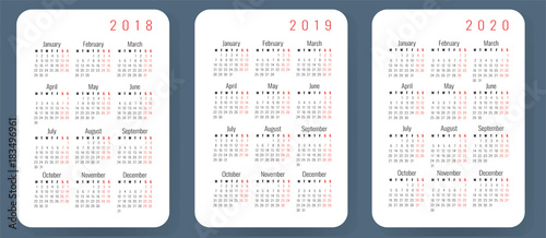 Calendar 2020 Year. Vector Pocket Or Wall Calender Template Pocket calendar 2019, 2020, 2021 set. Basic simple template. Week .